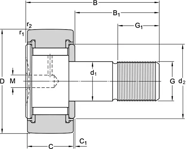 Опорные ролики с осевым направлением посредством края и направляющего подкладного кольца с полным заполнением игольчатых роликов. Нескользящее уплотнение. С уплотнительными кольцами. Имеется отверстие для смазки.