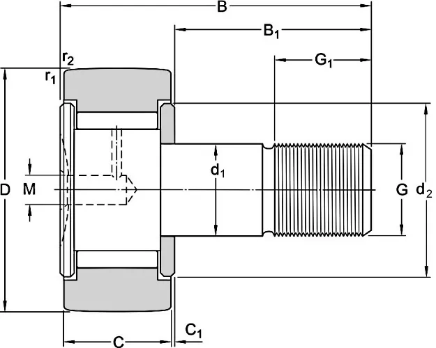 Опорные ролики с осевым направлением посредством края и направляющего подкладного кольца с полным заполнением игольчатых роликов. Нескользящее уплотнение. Имеется отверстие для смазки.