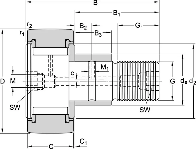 Опорные ролики с осевым направлением посредством края и направляющего подкладного кольца с полным заполнением игольчатых роликов, с эксцентриками и уплотнительными кольцами. Нескользящее уплотнение. Имеется отверстие для смазки.