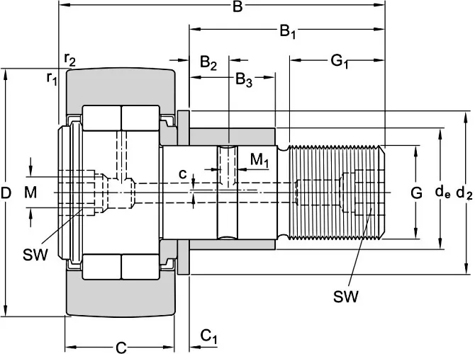 Опорные ролики с осевым направлением посредством тел качения, с полным заполнением цилиндрических роликов, с эксцентриком. Лабиринтное уплотнение. Имеется отверстие для смазки.