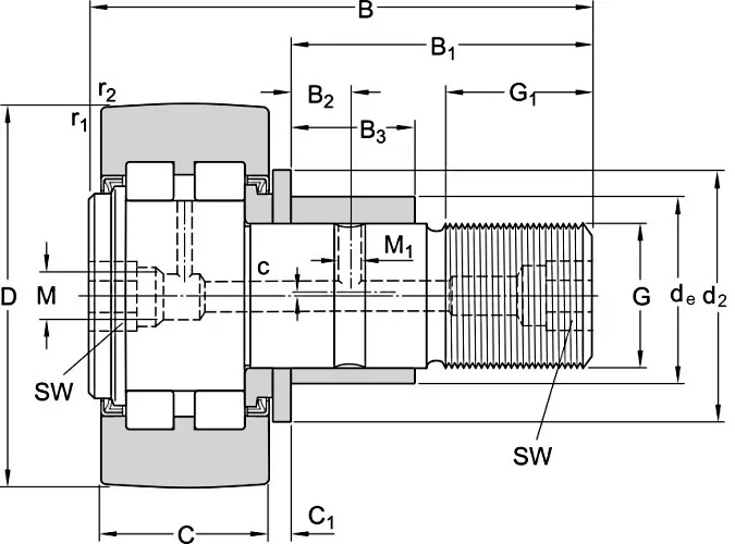 Опорные ролики с осевым направлением посредством тел качения, с полным заполнением цилиндрических роликов с центральным краем, с эксцентриком. Защитные манжетные уплотнения. Имеется отверстие для смазки.