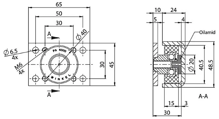 Аксиальные подшипники Winkel с покрытием POLYAMID и вставкой OILAMID с крепёжным фланцем характеризуются низким уровнем шума при работе и высокими скоростями до 5 м/сек., однако, стоит иметь в виду, что при повышении скорости перемещения нагрузочные характеристики снижаются. Максимальная рабочая температура 40oC.