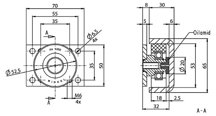 Аксиальные подшипники Winkel с покрытием POLYAMID и вставкой OILAMID с крепёжным фланцем характеризуются низким уровнем шума при работе и высокими скоростями до 5 м/сек., однако, стоит иметь в виду, что при повышении скорости перемещения нагрузочные характеристики снижаются. Максимальная рабочая температура 40oC.