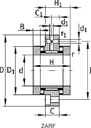 Радиальный игольчатый роликовый подшипник, комбинированный с упорными подшипниками с цилиндрическими роликами и промежуточным кольцом с фланцевым креплением (легкая серия). Внешнее кольцо с отверстиями для монтажа с помощью винтов.